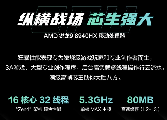 不止GPU核心的性能強大,天選6 Pro銳龍版還搭載了16大核32線程的AMD銳龍9 8940HX處理器,其集成80MB高速緩存,可令游戲的幀數(shù)表現(xiàn)更加出色。同時還有天選6 Pro全新升級的冰川散熱系統(tǒng),內(nèi)吹技術(shù)2.0、二代絕塵風(fēng)扇、貫穿式后出風(fēng)設(shè)計等黑科技加持,即便整夜鏖戰(zhàn)游戲也無懼電腦核心降頻、畫面卡頓。