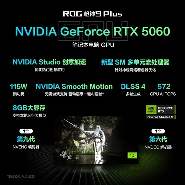 圖形性能方面,ROG槍神9 Plus配備NVIDIA GeForce RTX 5060筆記本電腦GPU,擁有8GB大顯存與全新Blackwell架構(gòu),能夠?qū)崿F(xiàn)115W滿功耗釋放,還支持NVIDIA DLSS 4技術(shù)以及NVIDIA Smooth Motion技術(shù)。AI技術(shù)助力,硬核玩家們將擁有更加絲滑舒適的游戲體驗(yàn)。同時(shí),為了適應(yīng)不同場(chǎng)景,ROG槍神9支持的雙顯三模顯卡熱切換技術(shù)可讓玩家們無(wú)需重啟電腦即可切換顯卡模式,在辦公時(shí)保持長(zhǎng)續(xù)航,在游戲時(shí)釋放澎湃性能,輕松適配各種需求。