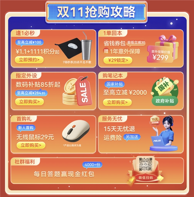雙十一華碩商城大波福利派發(fā)中,活動(dòng)期間下單即享優(yōu)惠福利,數(shù)碼補(bǔ)貼補(bǔ)貼85折起,購(gòu)機(jī)贈(zèng)3年延保+3次遠(yuǎn)程服務(wù)。點(diǎn)擊鏈接,了解更多福利詳情!
