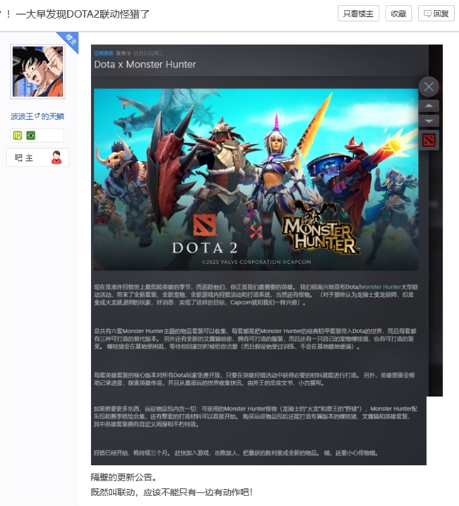 11月11日凌晨,游戲圈炸出“離譜但合理”的破圈級(jí)新聞——向來(lái)以“V社躺平式運(yùn)營(yíng)”著稱的《DOTA2》,竟與“萬(wàn)物皆可聯(lián)動(dòng)”的卡普空展開深度合作!一邊是Steam在線榜常年前二卻“佛系更新”的MOBA巨頭,一邊是《怪物獵人:荒野》創(chuàng)下140萬(wàn)在線紀(jì)錄的聯(lián)動(dòng)狂魔,這場(chǎng)看似八竿子打不著的跨界,直接打破“預(yù)熱炒作”的行業(yè)潛規(guī)則,以“零預(yù)告+硬核內(nèi)容”的姿態(tài)引爆社區(qū)。