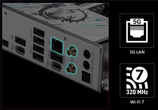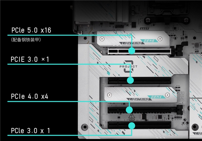 配備PCIe 5.0 x16顯卡插槽、3組M.2接口(含Gen5 x4 128Gbps),并覆蓋冰霜鎧甲散熱。網(wǎng)絡(luò)方面搭載Wi-Fi 7與5G有線網(wǎng)卡,配合MSI AI網(wǎng)絡(luò)管理器智能優(yōu)化游戲流量。