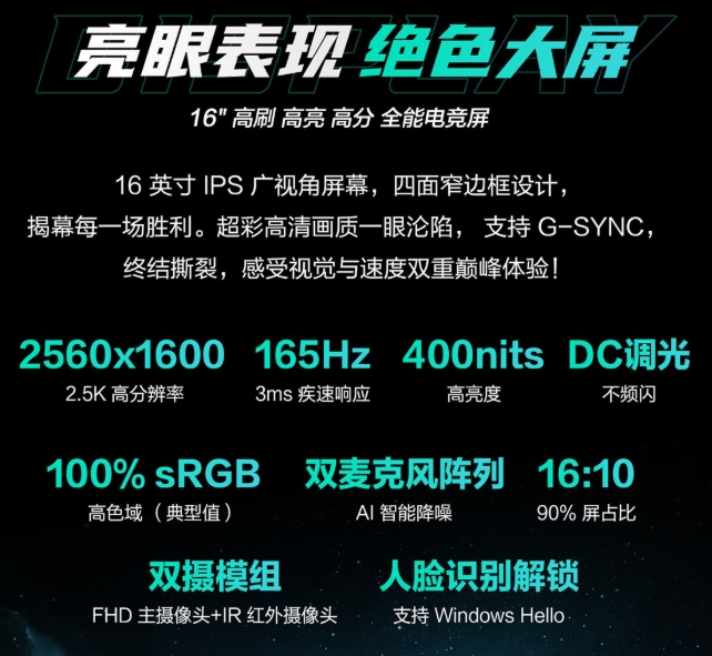 優(yōu)秀的屏幕素質(zhì)才能讓玩家真切享受到3A大作帶來的極致畫面沖擊。對此,天選6 Pro配備了一塊16英寸 2.5K 165Hz的全能電競屏,400nits的高亮度和100% sRGB使得游戲場景纖毫畢現(xiàn),還能保證剪輯創(chuàng)作時色彩明晰不失真。G-SYNC技術(shù)可大大減少游戲中的畫面撕裂情況,視覺效果更加流暢,讓FPS玩家能在戰(zhàn)場上占據(jù)先機,一舉奪勝。