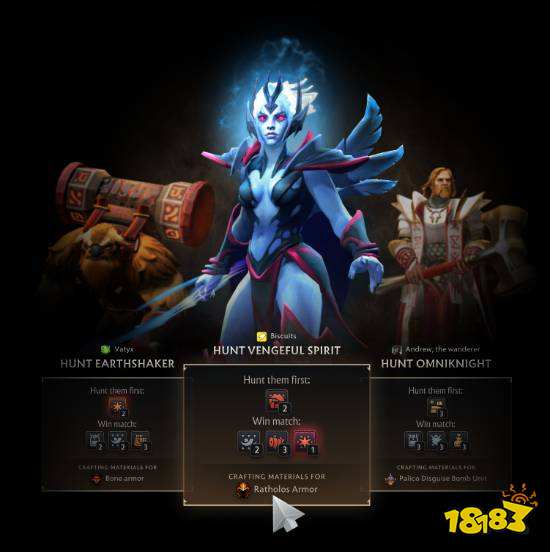 在每場Dota比賽開始時(shí),你可以選擇一名敵方英雄,作為狩獵的目標(biāo)。不同的英雄會(huì)獎(jiǎng)勵(lì)不同的打造材料。每個(gè)潛在目標(biāo)都會(huì)列出材料以及這些材料用來打造的套裝。可以根據(jù)接下來要打造的套裝來選擇提供特定材料的目標(biāo)。如果贏下比賽,將會(huì)獲得列出的所有材料。如果失敗,只會(huì)獲得其中的一部分。