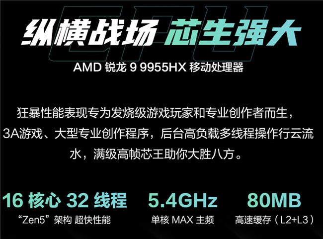 處理器方面,顧名思義,華碩天選6 Pro銳龍版采用全新的AMD 銳龍 9 9955HX處理器,16大核32線程,單核MAX頻率5.4GHz,擁有80MB高速緩存,可憑借超低響應(yīng)延遲實(shí)現(xiàn)游戲幀數(shù)的穩(wěn)定與提升,在《無畏契約》《CS2》等大火的FPS游戲中,都會(huì)有較為不錯(cuò)的表現(xiàn)。另外在全新冰川散熱系統(tǒng)以及內(nèi)吹技術(shù)的加持下,華碩天選6 Pro可達(dá)成至高180W的性能釋放,進(jìn)一步為玩家的游戲體驗(yàn)保駕護(hù)航。