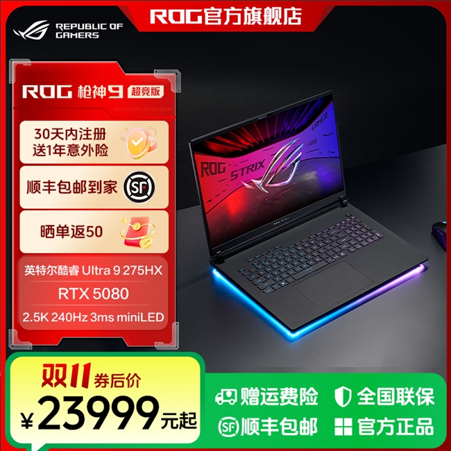 外觀設(shè)計(jì)上,槍神9/槍神9 Plus采用流線型機(jī)身,搭配圓潤邊角還原超跑美感,單鍵RGB影刃鍵盤+全環(huán)繞RGB底盤燈+RGB全發(fā)光Logo營造獨(dú)屬ROG的信仰電競氛圍,潮酷氣質(zhì)拉滿。此外,其還支持免工具快拆技術(shù),內(nèi)存、硬盤30秒即可升級換新,助力玩家輕松解鎖更高戰(zhàn)力。在雙十一期間,槍神9/槍神9 Plus分別迎來國補(bǔ)好價(jià)(部分地區(qū)),還提供曬單返50元、30天內(nèi)注冊即送1年意外險(xiǎn)等福利,想刷新電競體驗(yàn)的玩家切勿錯(cuò)過。